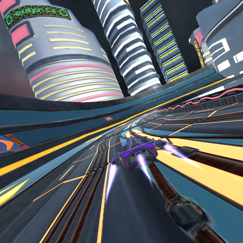 When creating the layout, we first defined the points of interest (Looping, garage and high turn).The goal was to find an interesting way to connect these points. So we worked on a vertical level design that gave the player the impression of going down along the buildings of a futuristic city.The circuit is incorporated into the city so that the player always has a reference point for his orientation.