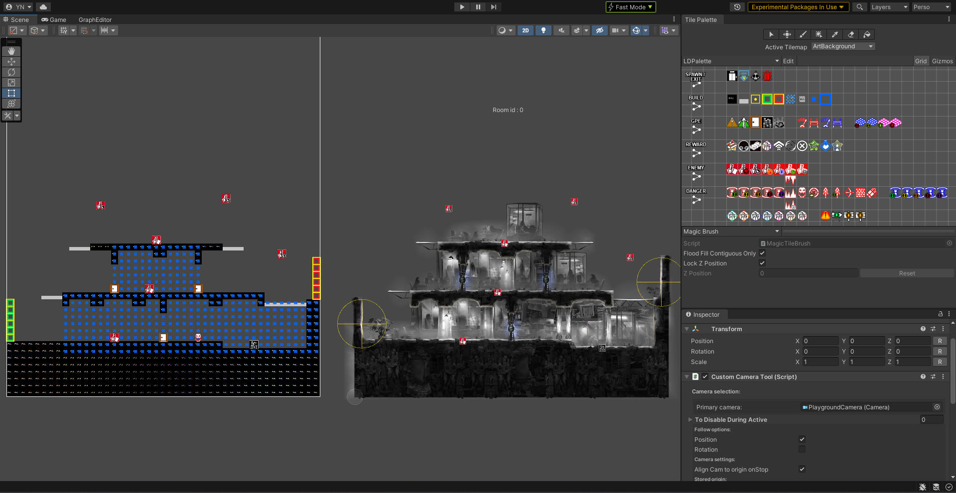 The room creation process allowed to iterate quickly by placing tiles directly on the left side. Just update the room and place it in the generation bucket to be able to test directly in game. During the creation you can see the result with the baked art kit to get rid of all the graphic artifacts instantly.
